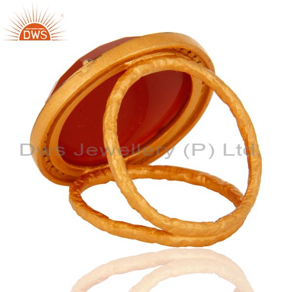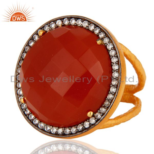 22K Yellow Gold Plated Red Onyx Gemstone Prong Set Sterling Silver Ring With Cz