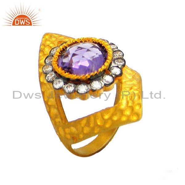 22K Yellow Gold Plated Sterling Silver Amethyst And Cz Textured Designer Ring