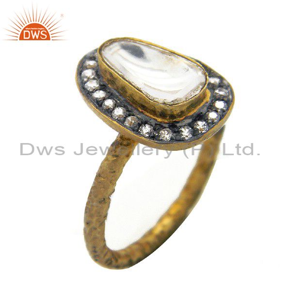 22K Yellow Gold Plated Sterling Silver Crystal Cz Polki Hammered Stackable Ring