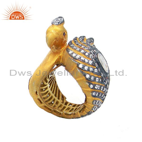 22K Yellow Gold Plated Sterling Silver Cz Crystal Polki Birds Cocktail Ring