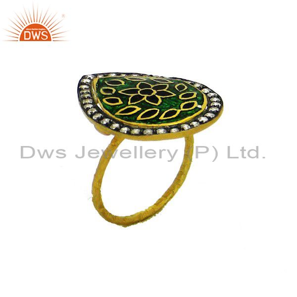 22K Yellow Gold Plated Sterling Silver Enamel Floral Design And Cz Cocktail Ring