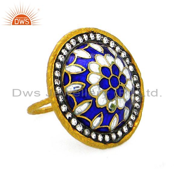 22K Yellow Gold Plated Sterling Silver Enamel Pattern Cocktail Ring With Cz