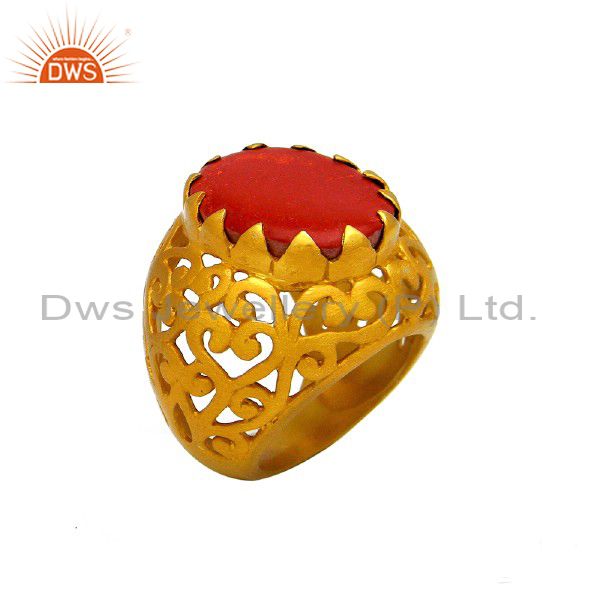22K Yellow Gold Plated Sterling Silver Red Coral Filigree Designer Dome Ring