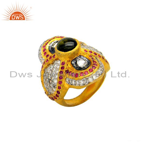 22K Yellow Gold Plated Sterling Silver Ruby And Cz Polki Designer Statement Ring