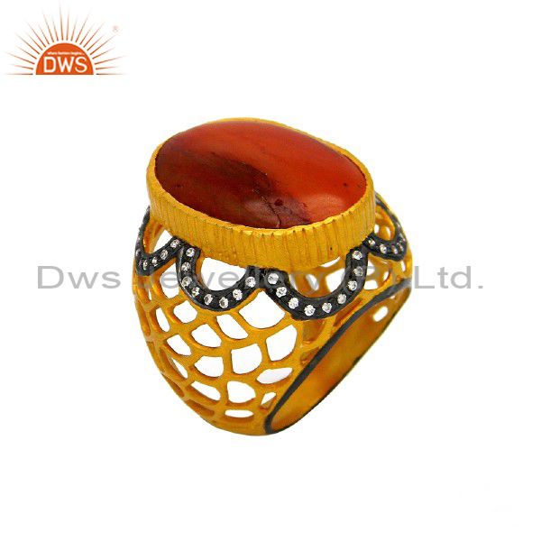 24K Yellow Gold Plated Sterling Silver Red Jade And Cz Filigree Cocktail Ring