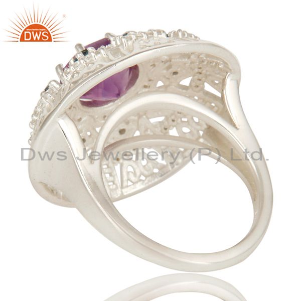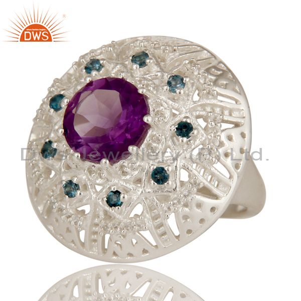 925 Sterling Silver Amethyst, Blue Topaz And White Topaz Designer Cocktail Ring