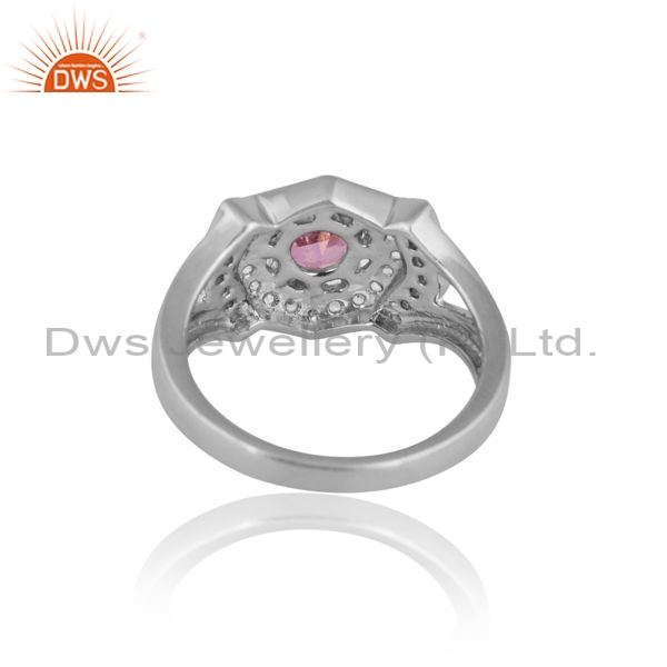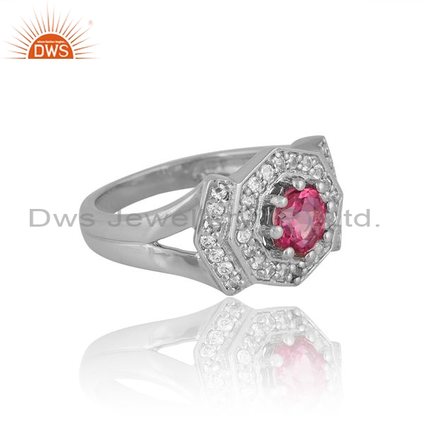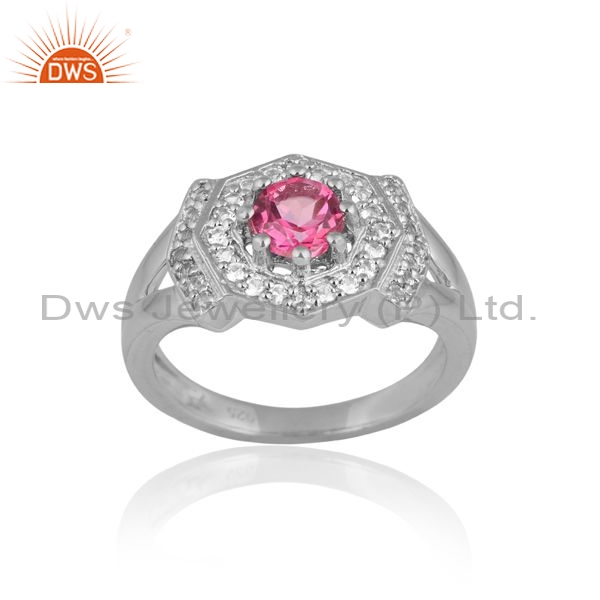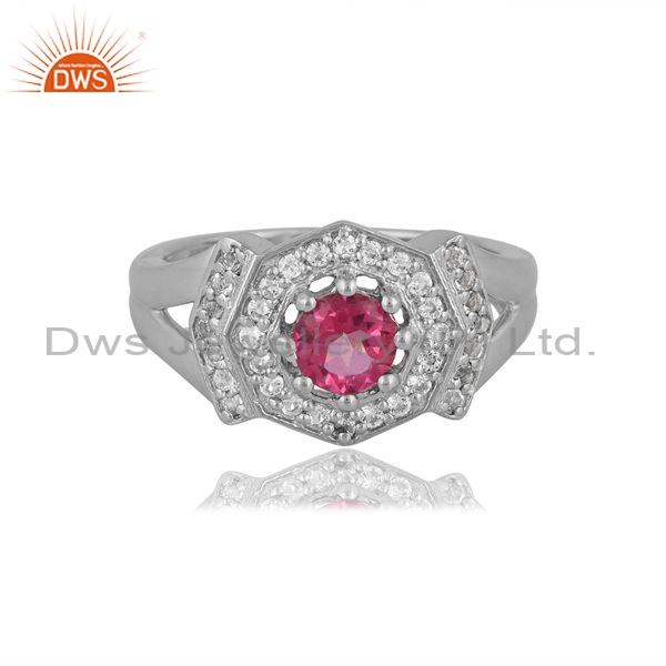 925 Sterling Silver Ring With Pink And White Topaz Round Cut