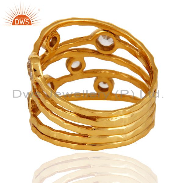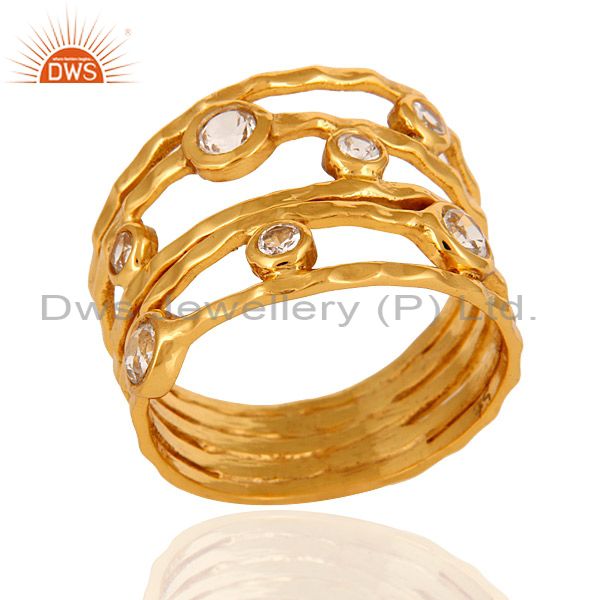 9K Solid Yellow Gold White Topaz Gemstone Hammered Wide Ring