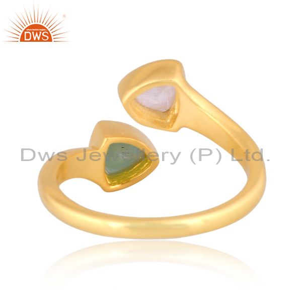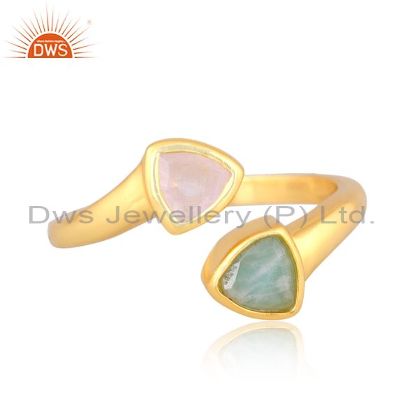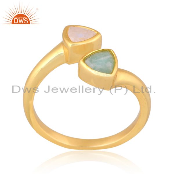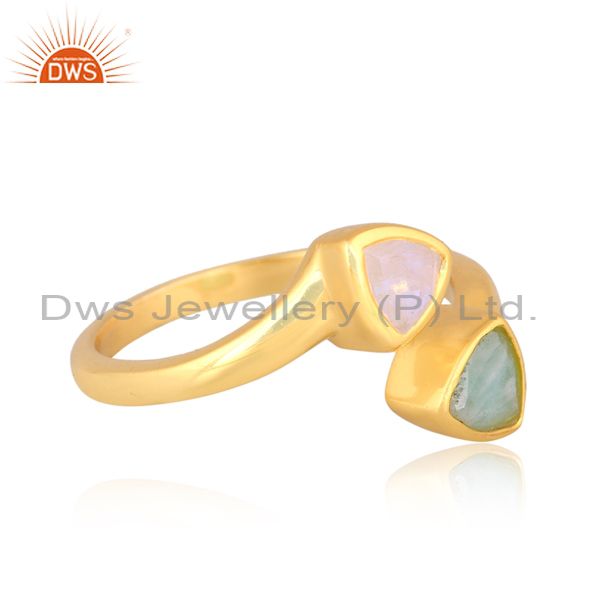 Amazonite And Rainbow Moon Stone Set Gold On 925 Silver Ring