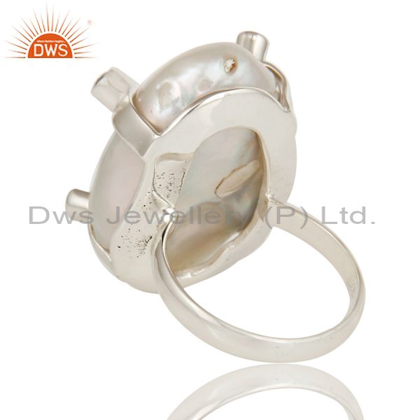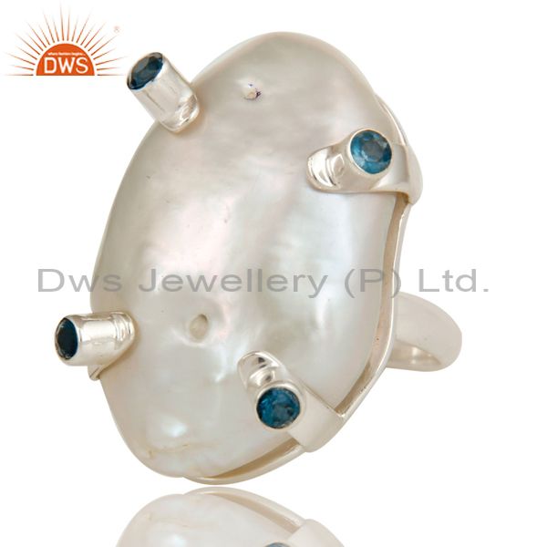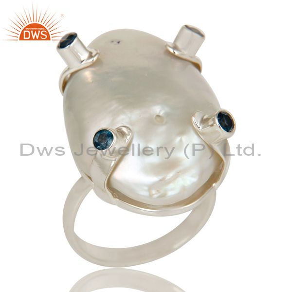 Baroque Pearl and London Blue Topaz Prong Set Sterling Silver Ring