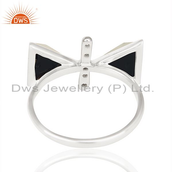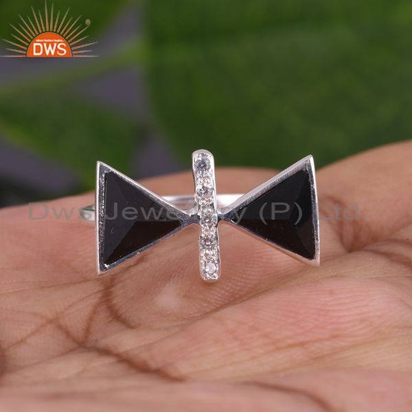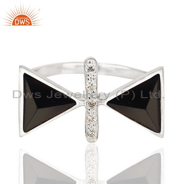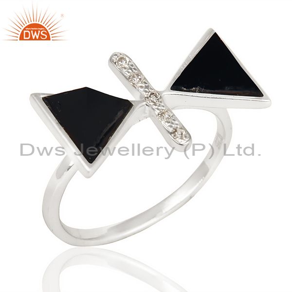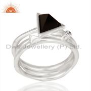 Black Onyx Triangle Cut Pyramid Cz Studded Solid 92.5 Sterling Silver Ring