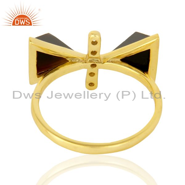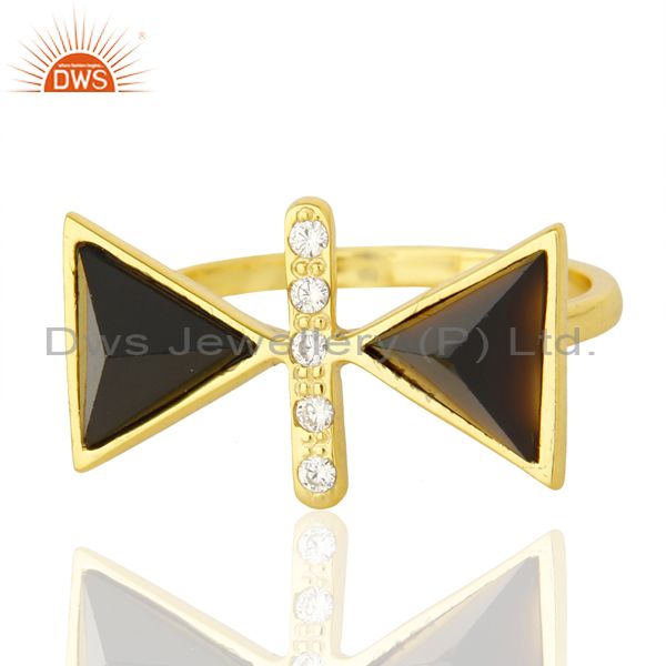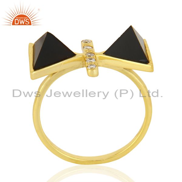 Black Onyx Triangle Cut Pyramid Cz Studded 14 K Gold Plated Silver Ring
