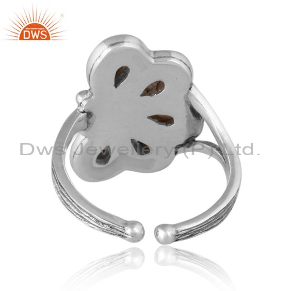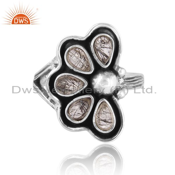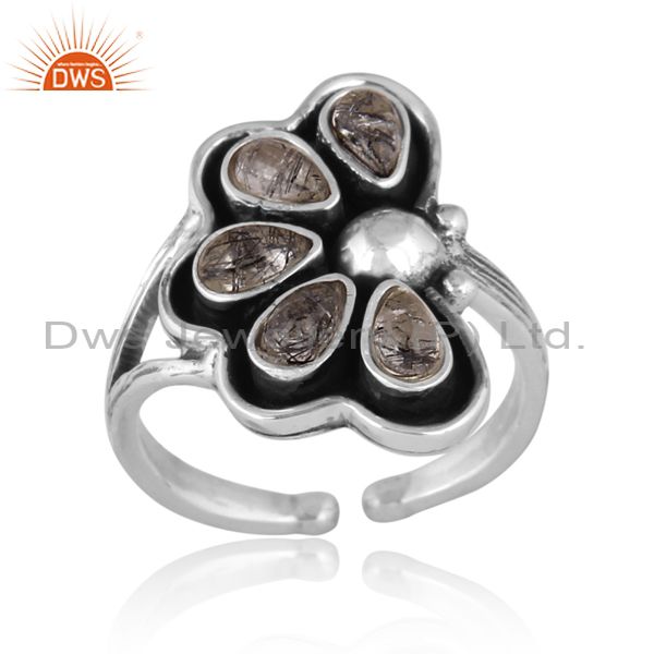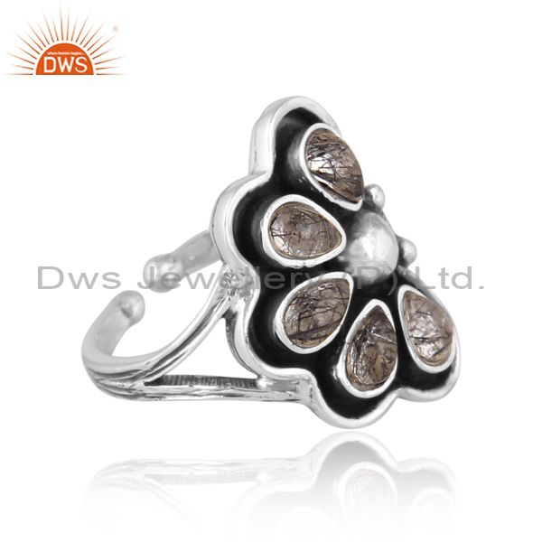 Black Rutile Set Oxidized Sterling Silver Ethnic Floral Ring