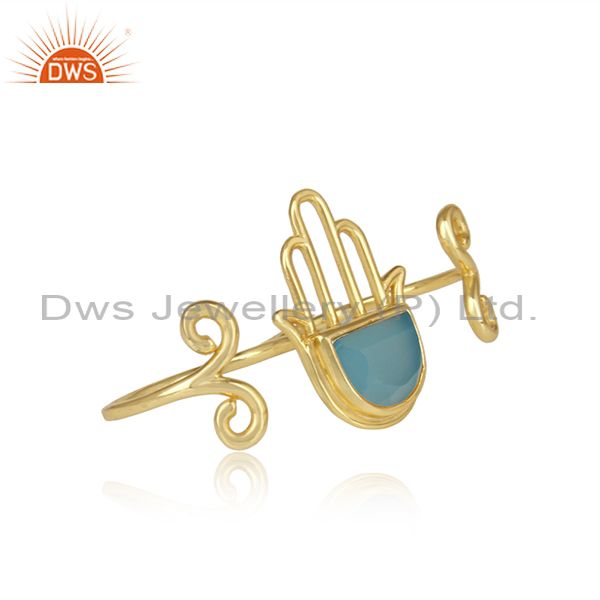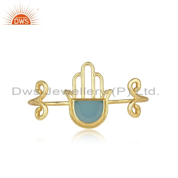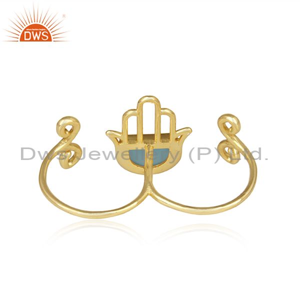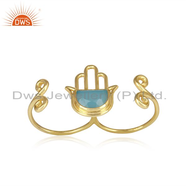 Blue Chalcedony Hasma Two Finger Gold Plated Silver Ring