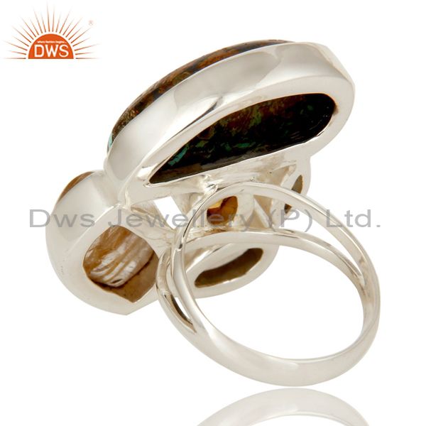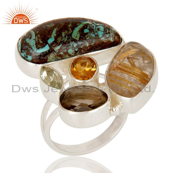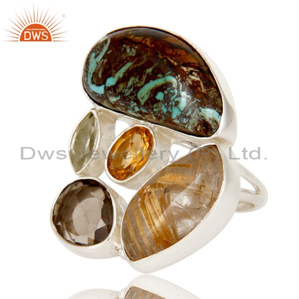 Boulder Turquoise, Rutile Citrine and Multi Gemstone Colorful 925 Silver Ring