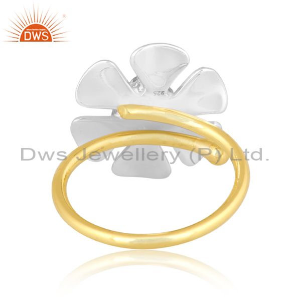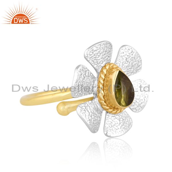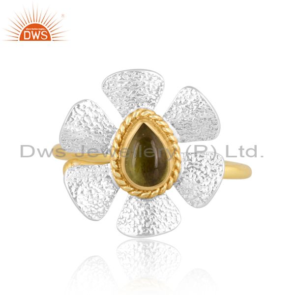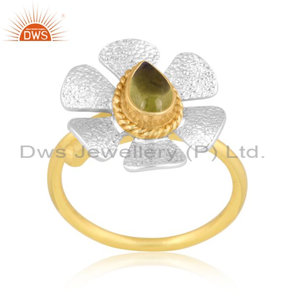 Brass Gold Floral Ring With Peridot Cabochon Checker Stone