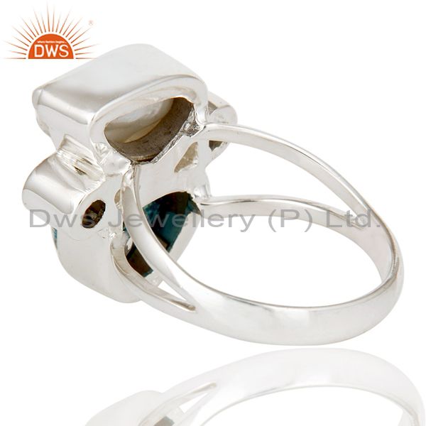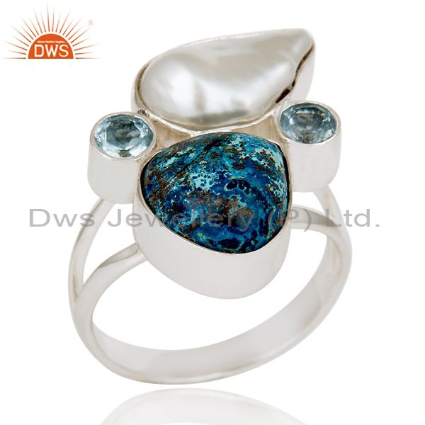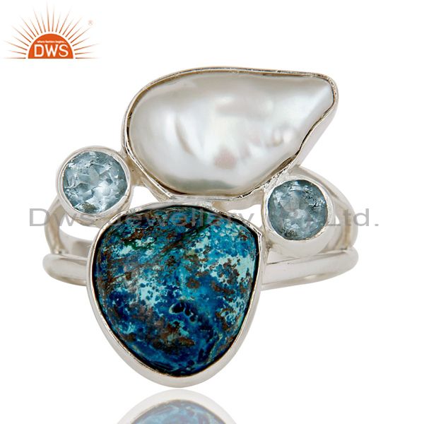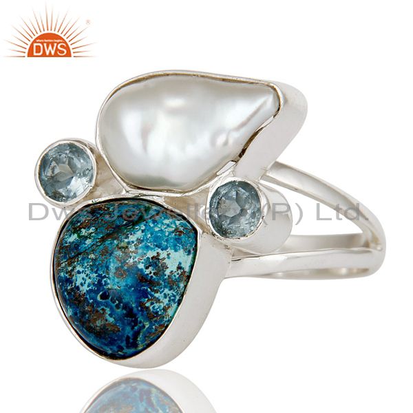 Chrysocola, Blue Topaz & Fresh Water Pearl 925 Sterling Silver Designer Ring