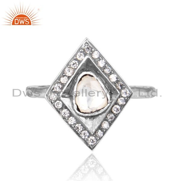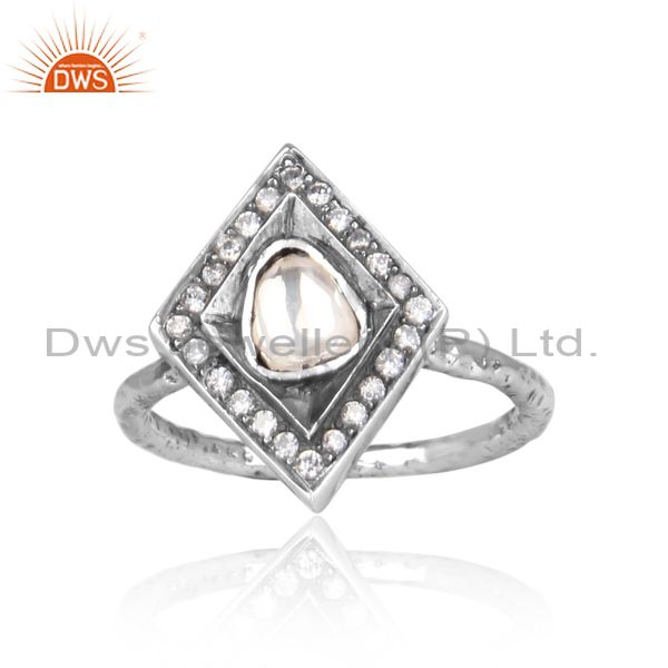CZ And Crystal Quartz Set Oxidized Silver Ethnic Boho Ring