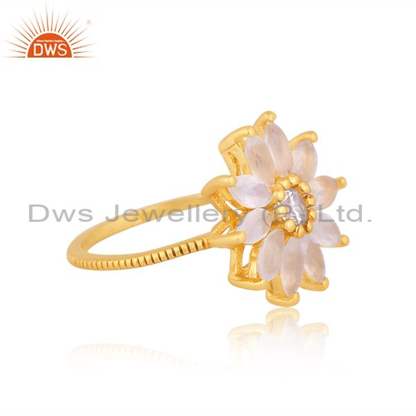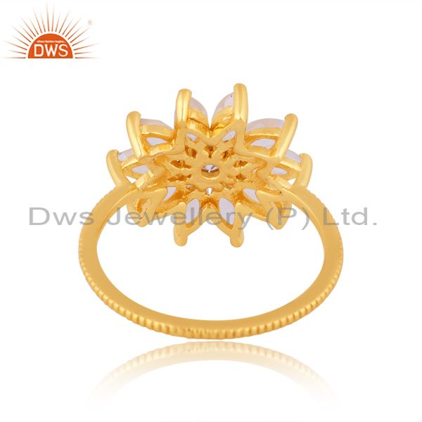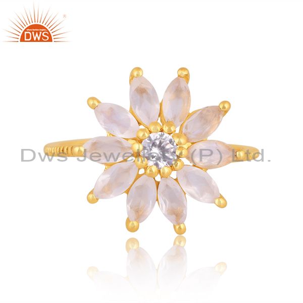 Cz And Rainbow Moon Stone Set Floral 18K Gold On Silver Ring