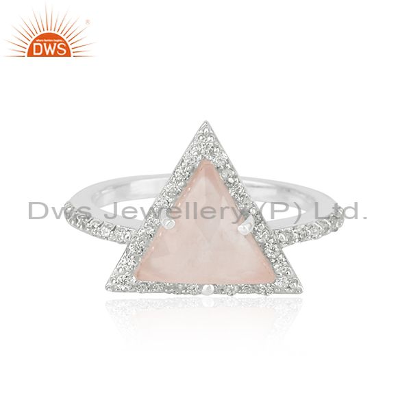 CZ Rose Quartz Gemstone Triangle Shape Sterling Silver Ring Jewelry