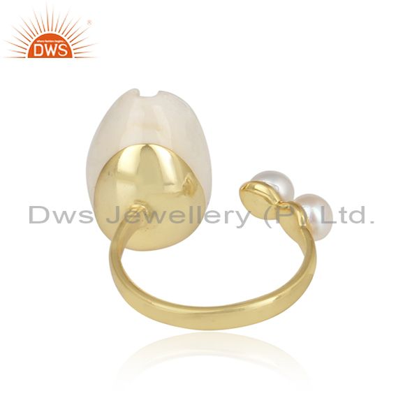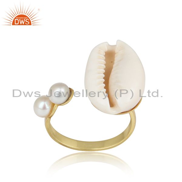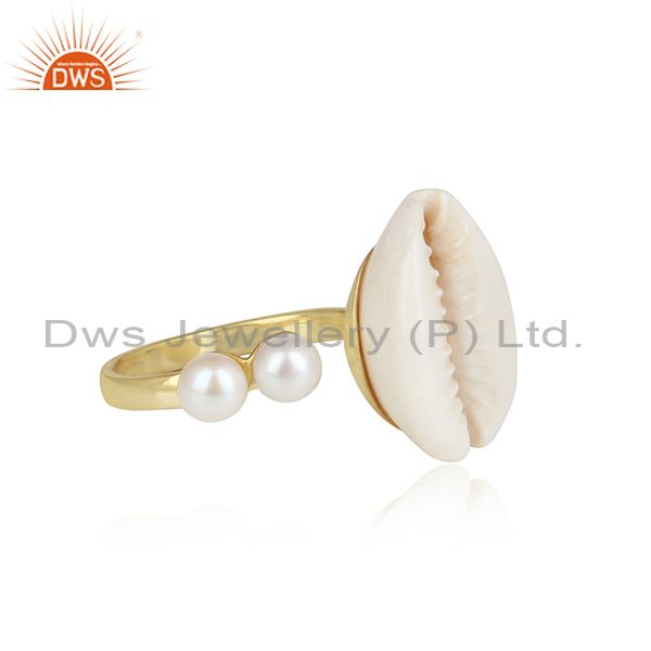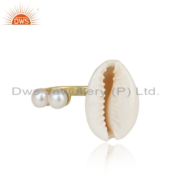 Double Pearl And Cowrie Brass Gold Adjustable Ring
