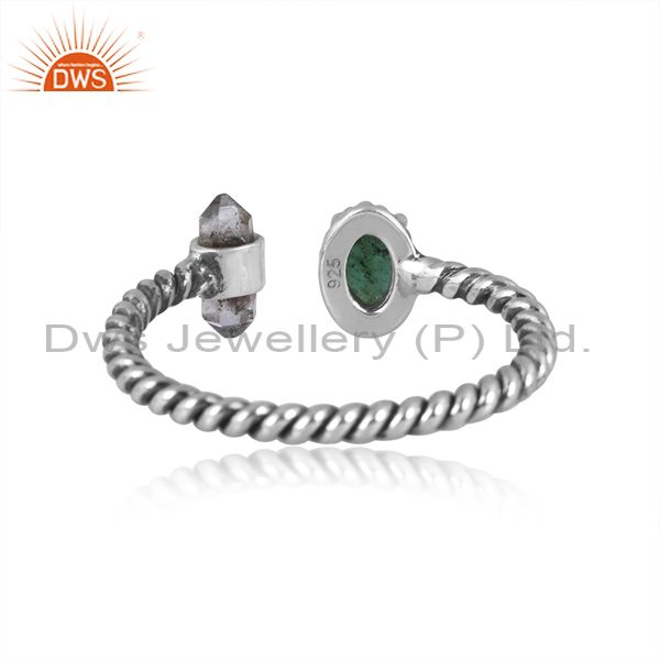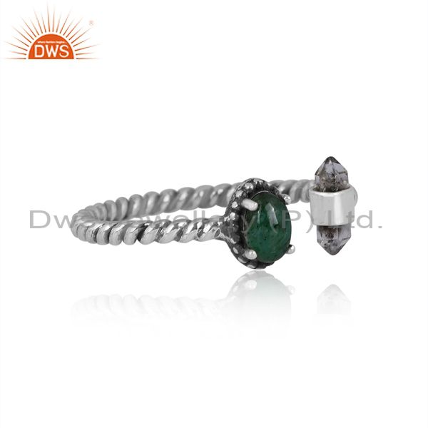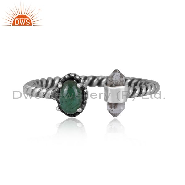 Emerald And Herkimer Diamond Set Oxidized 925 Silver Ring