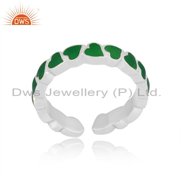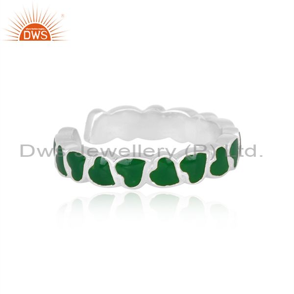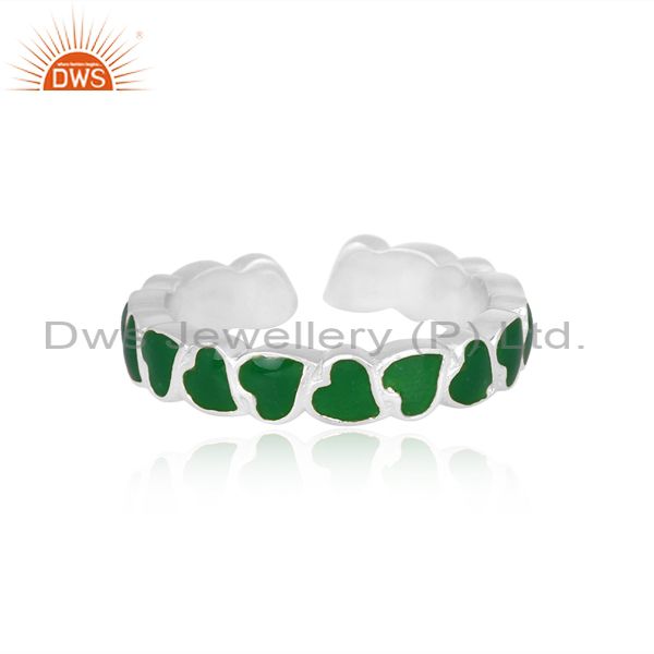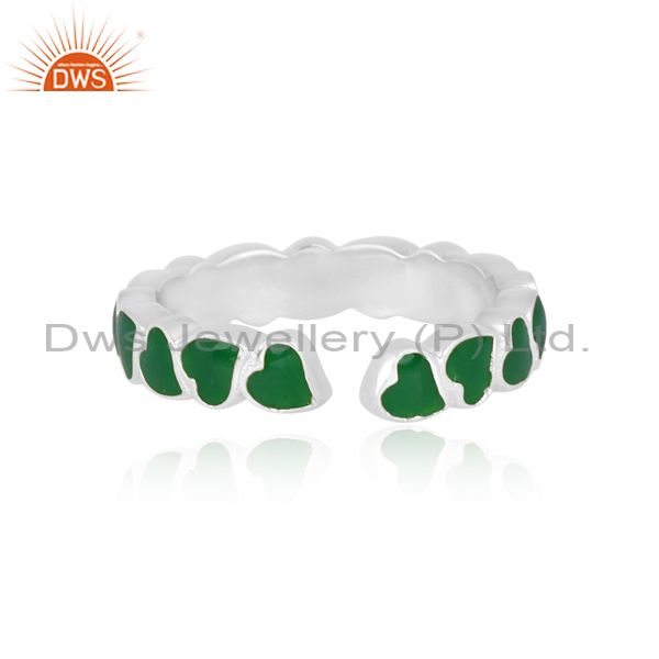 Fine 925 Silver Heart Shaped Green Enameled Classic Ring