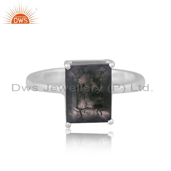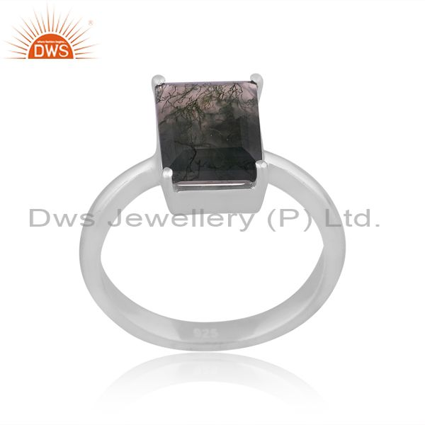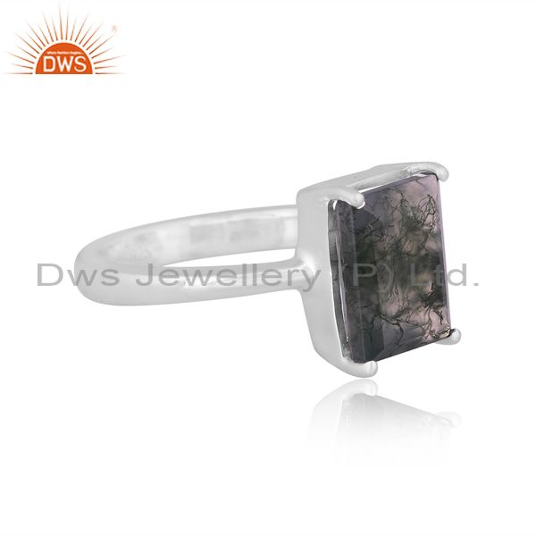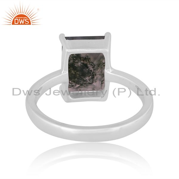 Fine 925 Sterling Silver Rectangle Cut Moss Agate Set Ring