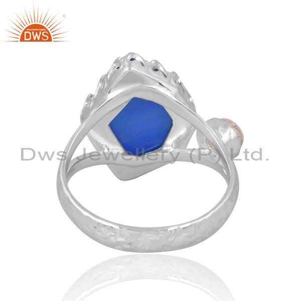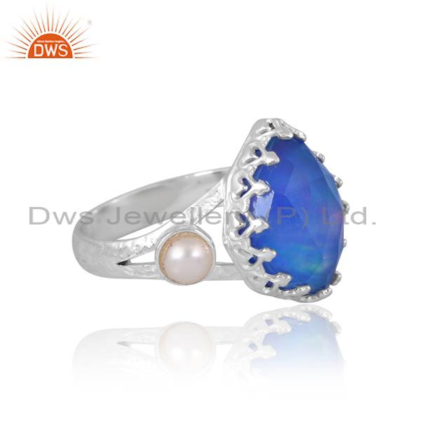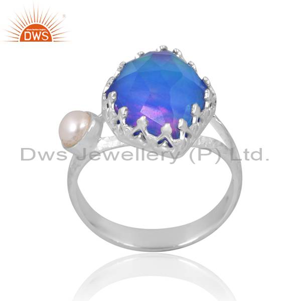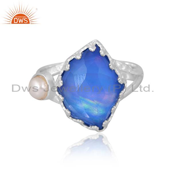 Finger Ring With Square Cut Aurora Opal Blue And Round Pearl