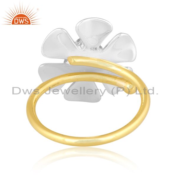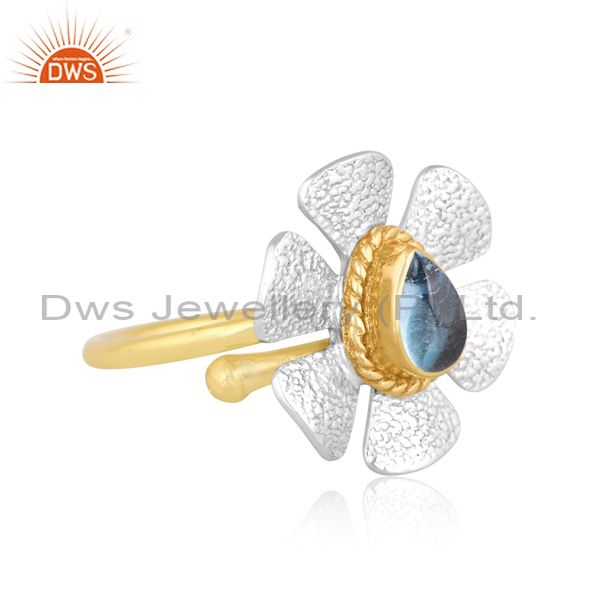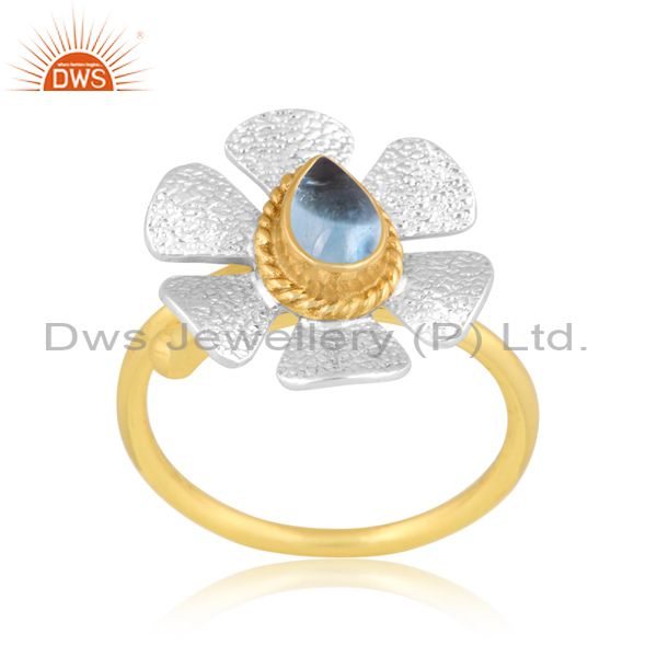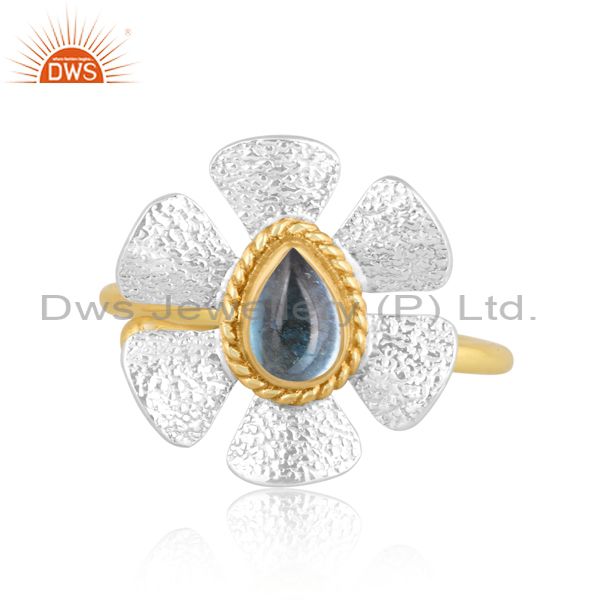 Floral Design Brass Ring With Blue Topaz Pear Cut Stone