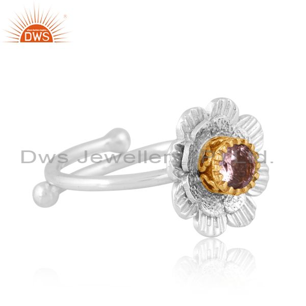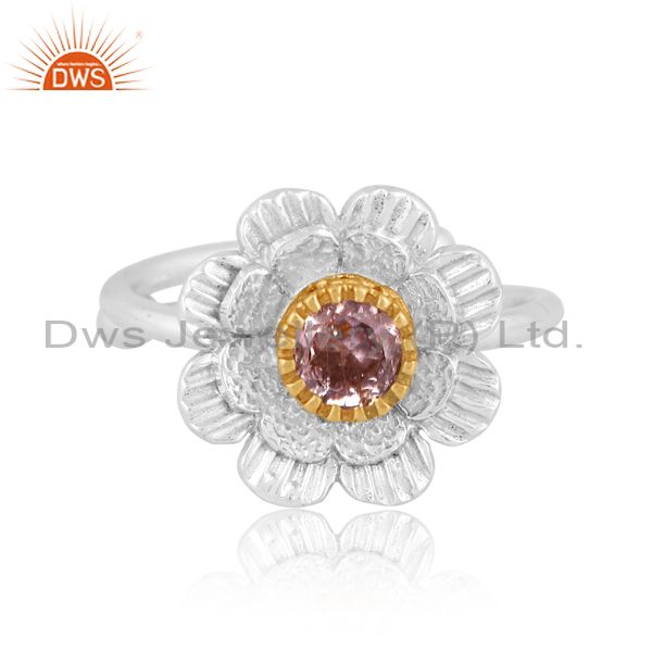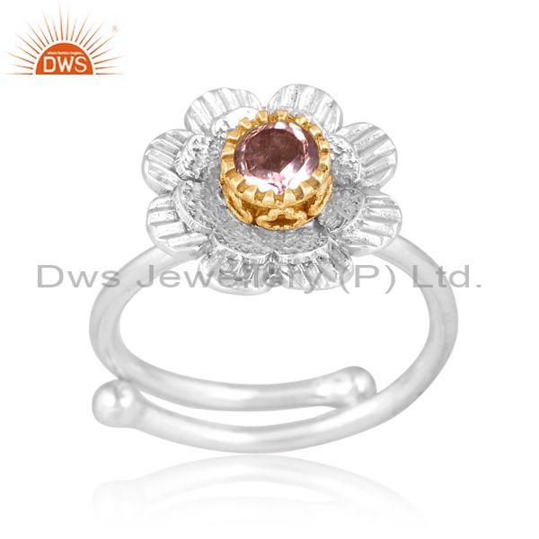 Floral Silver Ring With Gold Highlights & Pink Amethyst Gem