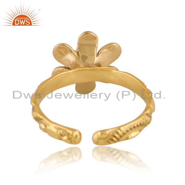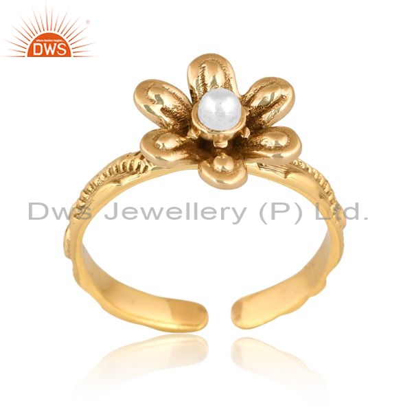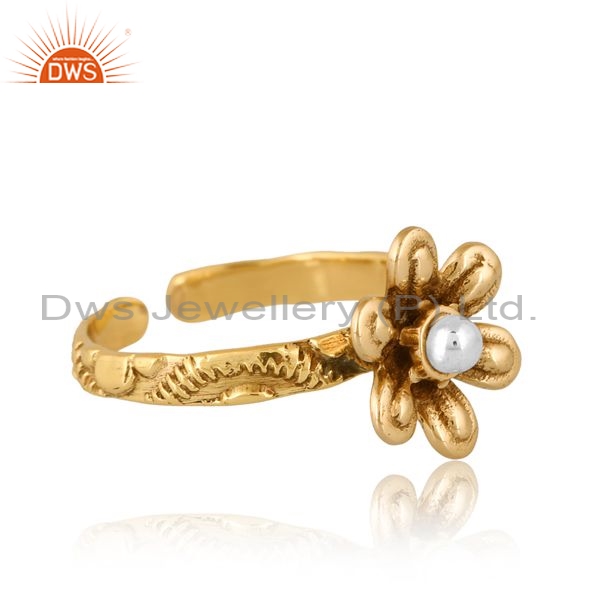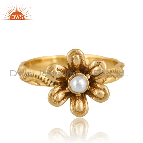 Gold Brass Floral Ring With White Ball In Middle