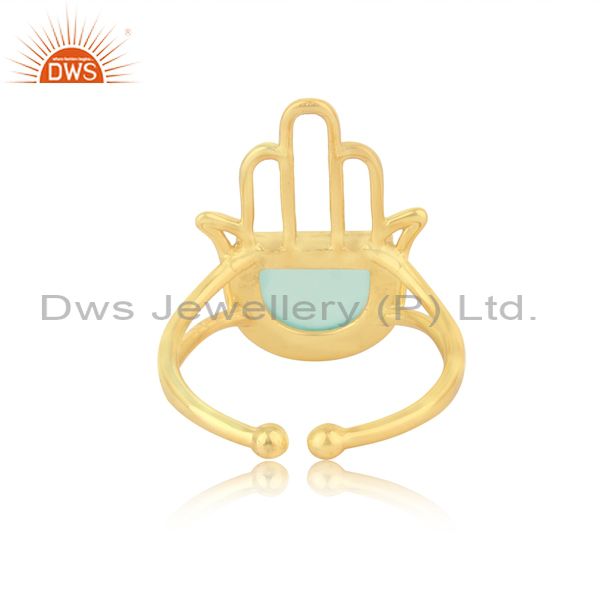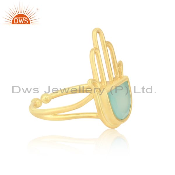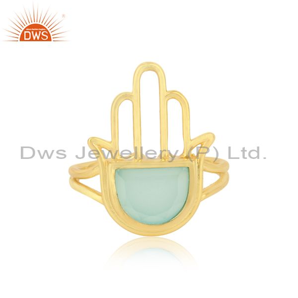 Gold On 925 Silver Hamsa Hand Aqua Chalcedony Designer Ring