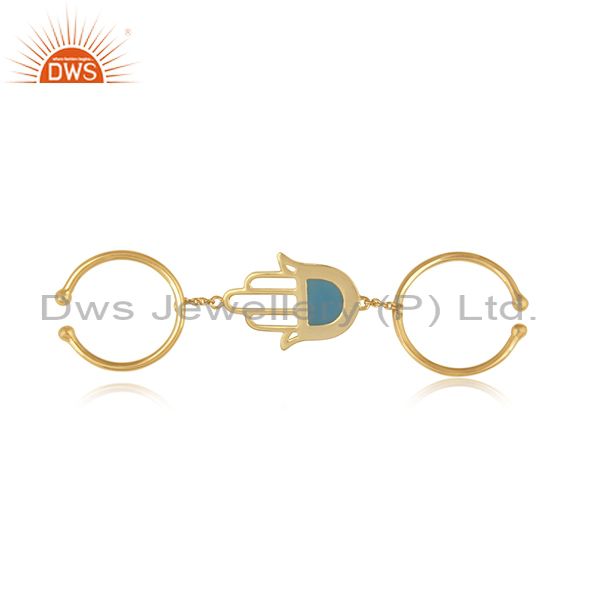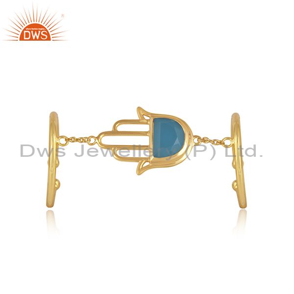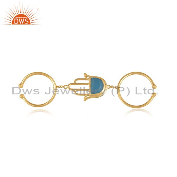Hamsa Designer Yellow Gold on Silver 925 Ring with Blue Chalcedony