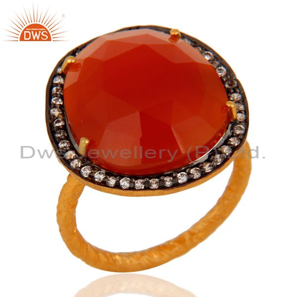 Handmade 22K Yellow Gold Plated Natural Red Onyx Faceted Gemstone Ring With CZ
