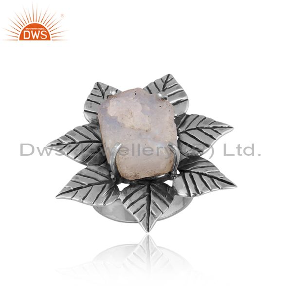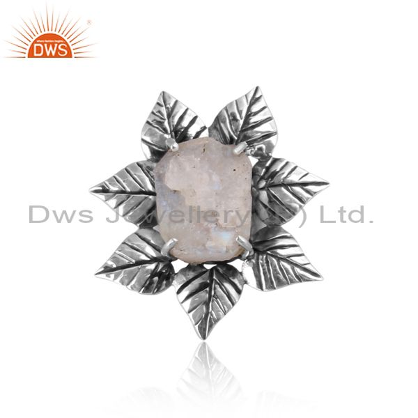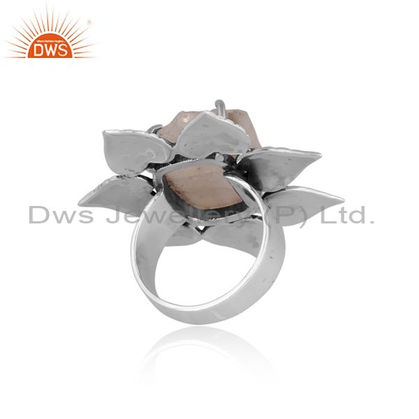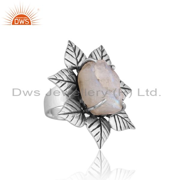 Handmade Rainbow Moon Stone Oxide Silver Floral Pattern Ring