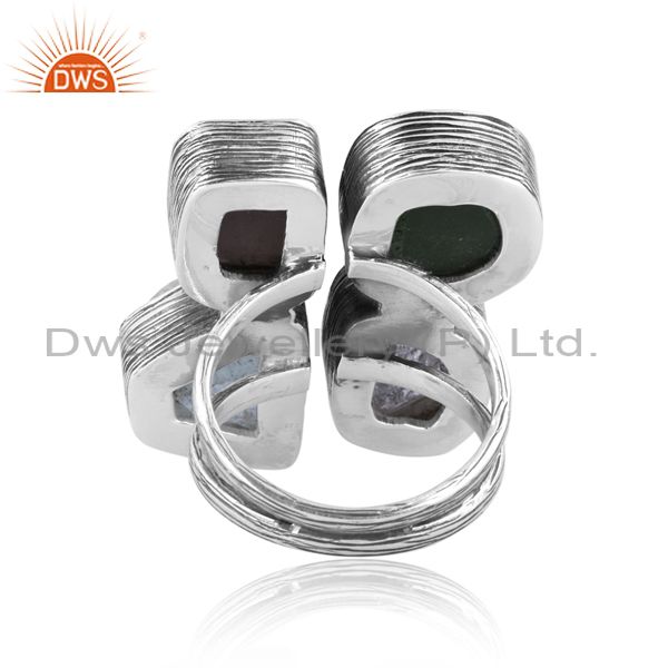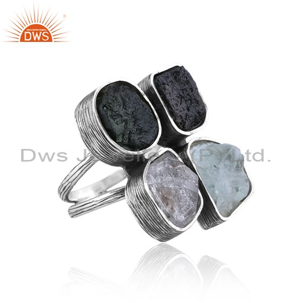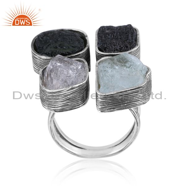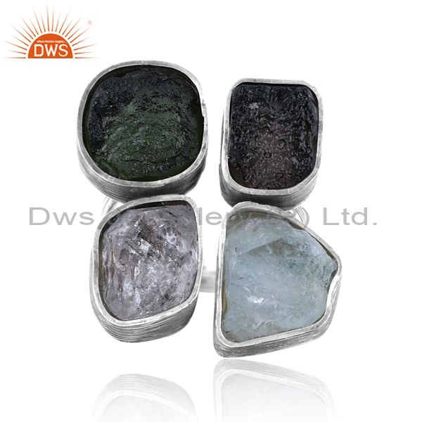Herkimer Diamond And Aquamarine Set Oxidized 925 Silver Ring