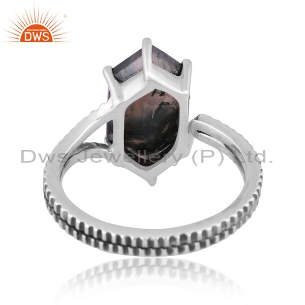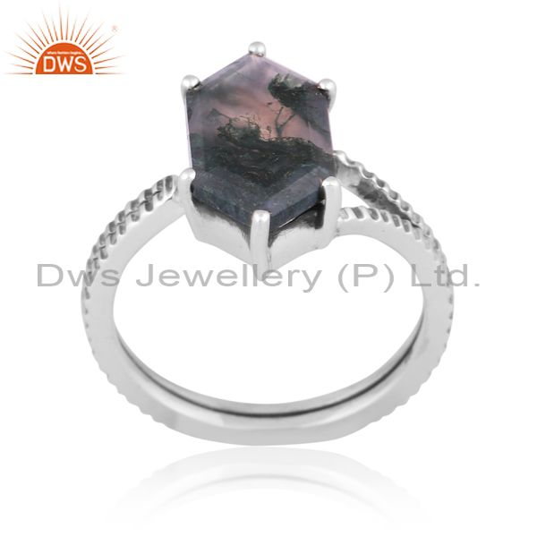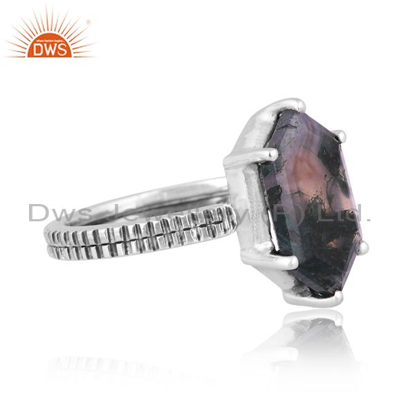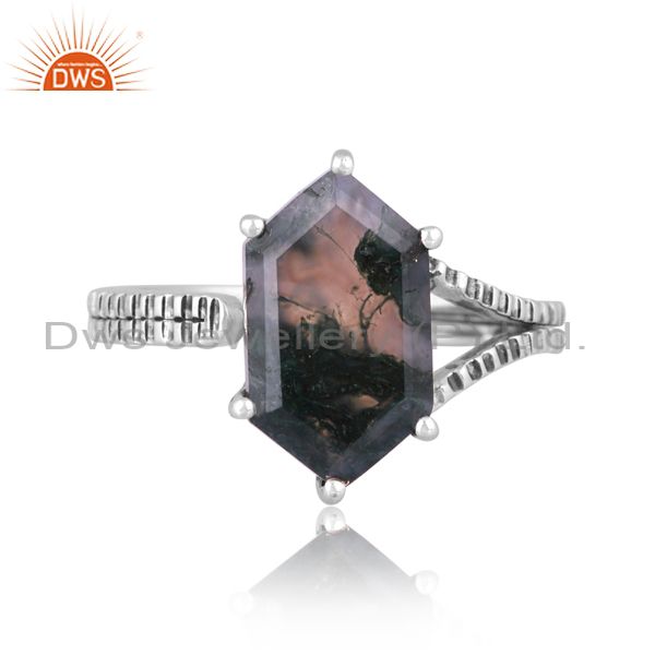 Hexagon Cut Moss Agate Set Oxide Sterling Silver Fancy Ring