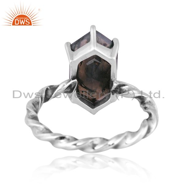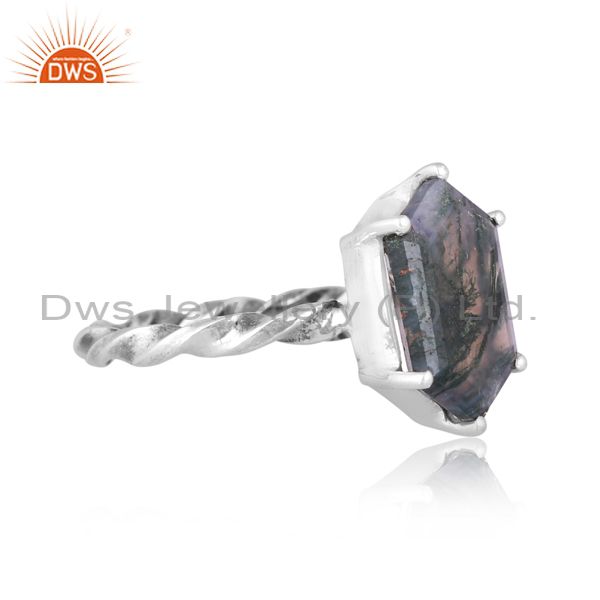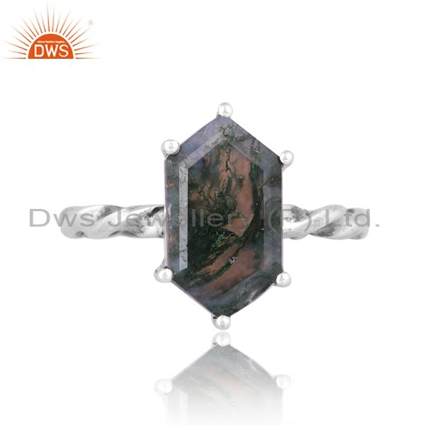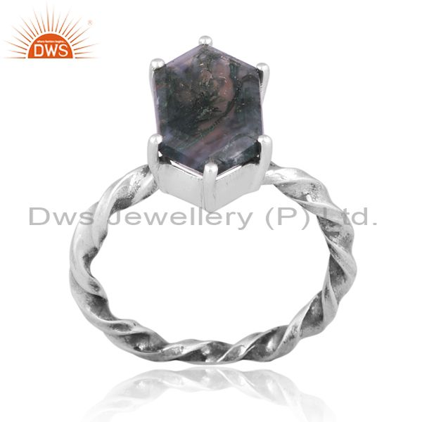 Hexagonal Moss Agate Set Oxidized 925 Sterling Silver Ring