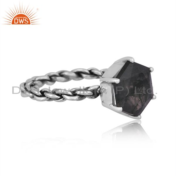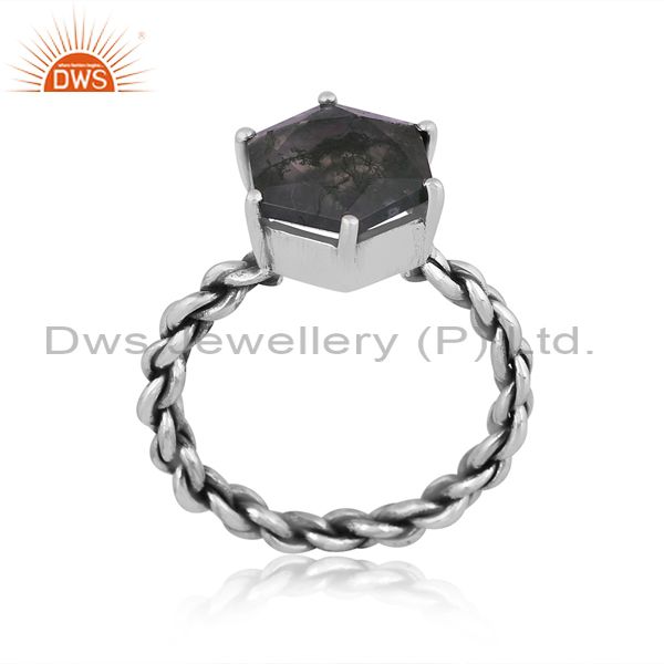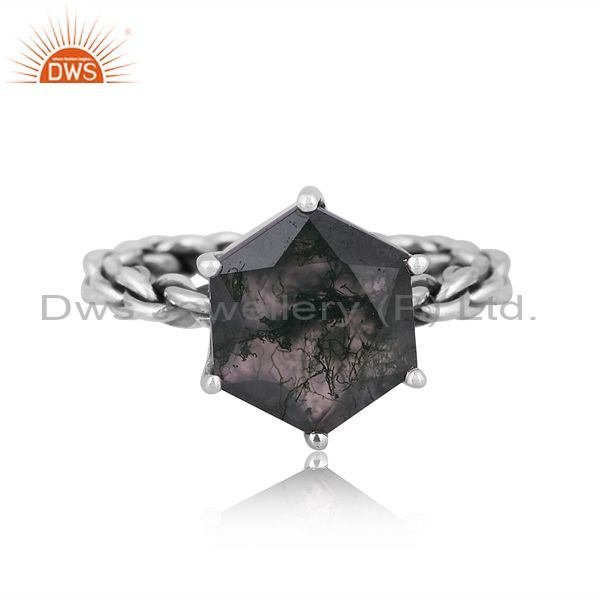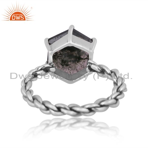 Hexagonal Moss Agate Set Oxidized Silver Handmade Twist Ring