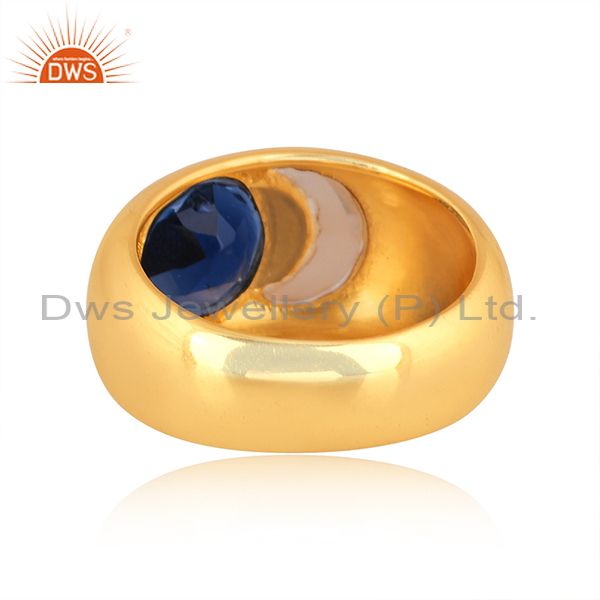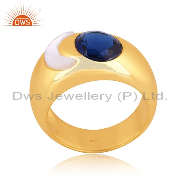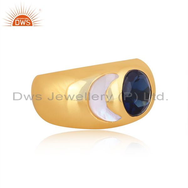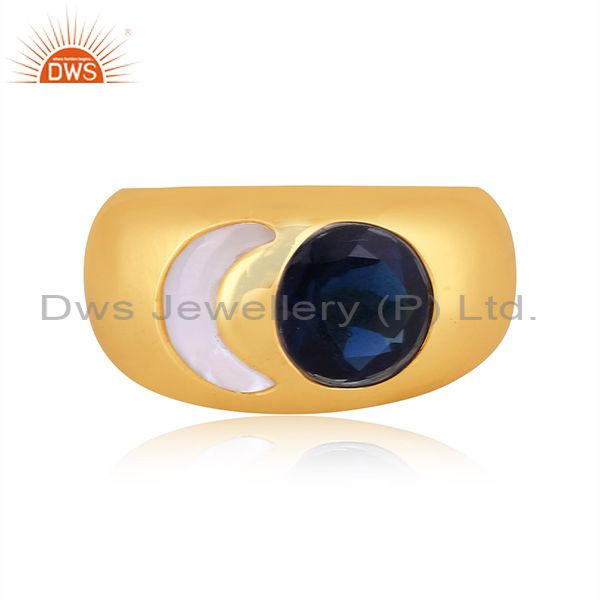 Mother Of Pearl Coin And Corundum Blue Gold On Silver Ring