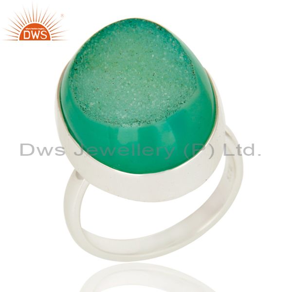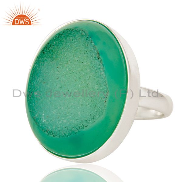 Oval Shape Sea Green Drusy Agate Genuine Sterling Silver Bezel-Set Ring