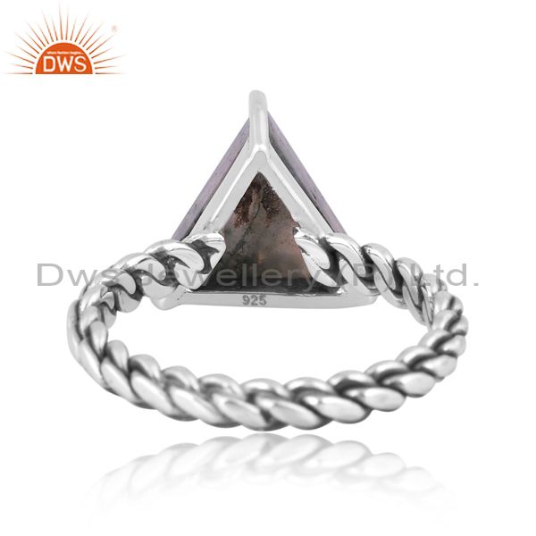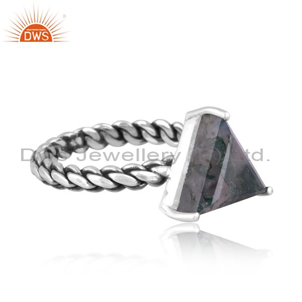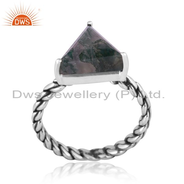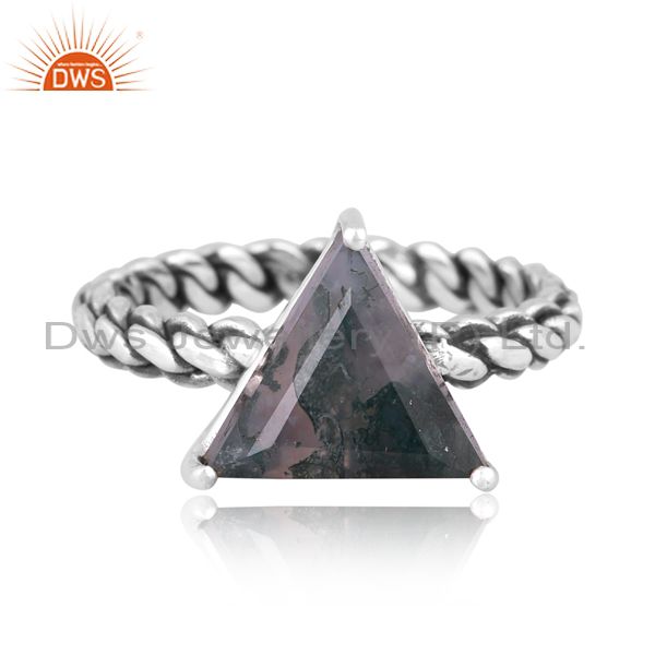 Oxidized Silver Triangular Moss Agate Set Handmade Twist Ring
