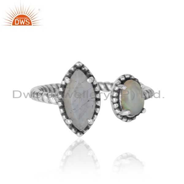 Oxidized Silver Twisted Ring with Rainbow Moonstone Ethiopian Opal