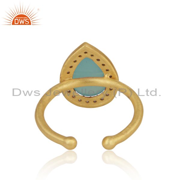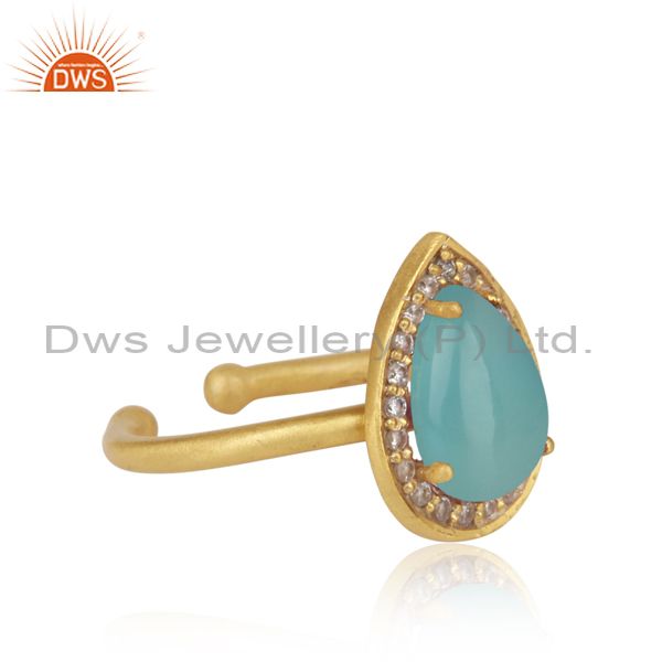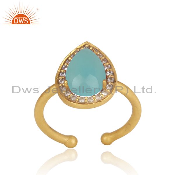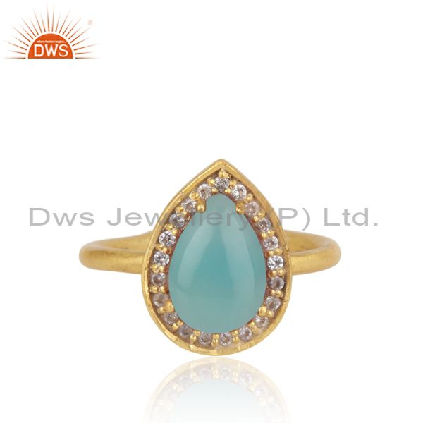 Pear Shaped Aqua Chalcedony And CZ Set Gold On Silver Ring