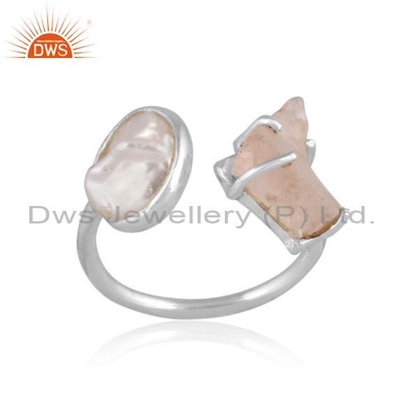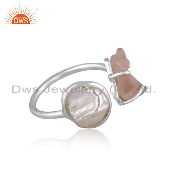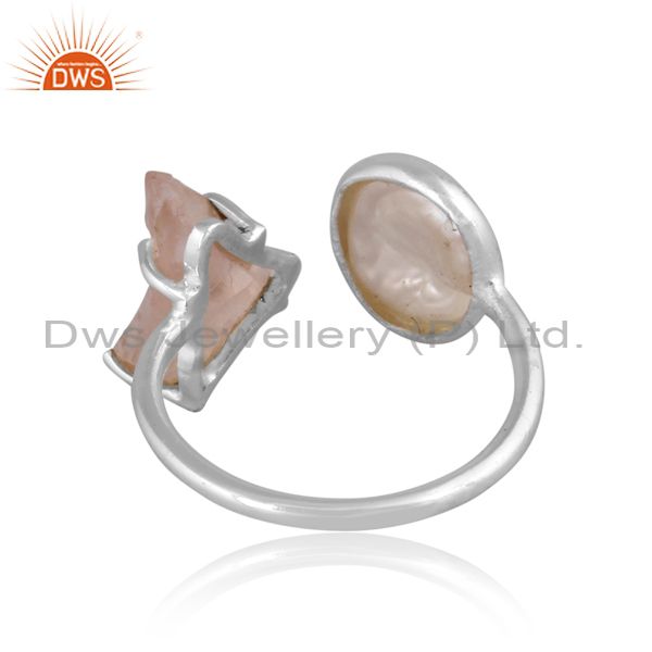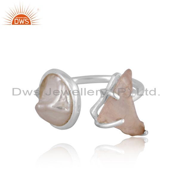 Pearl Beads And Rose Quartz Set Fine 925 Silver Open Ring