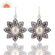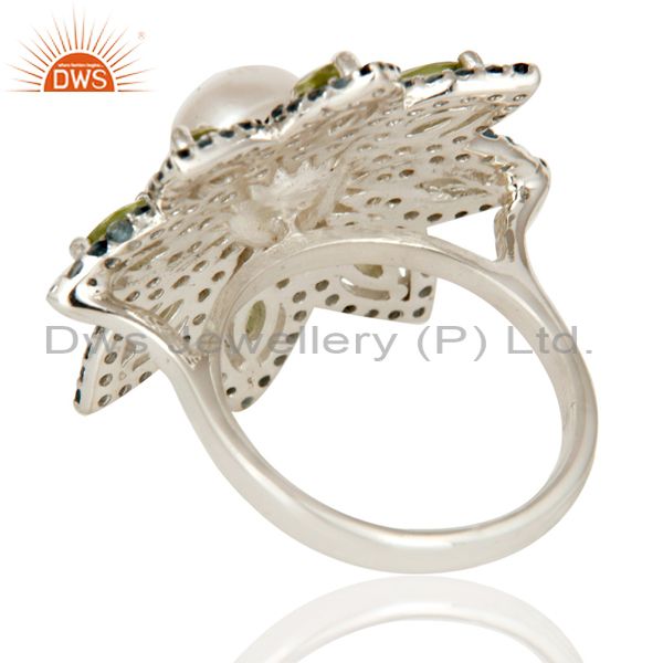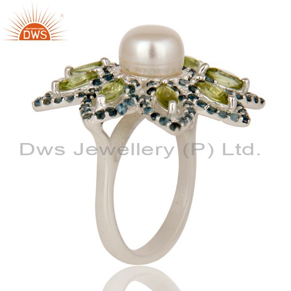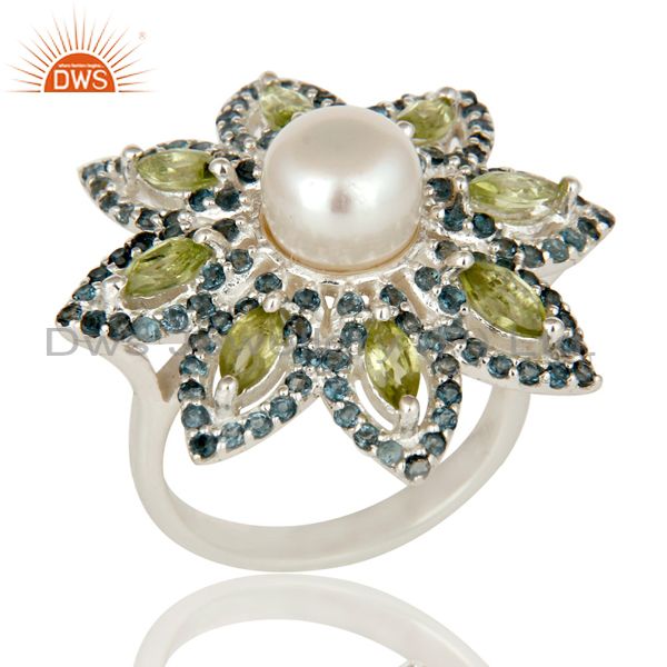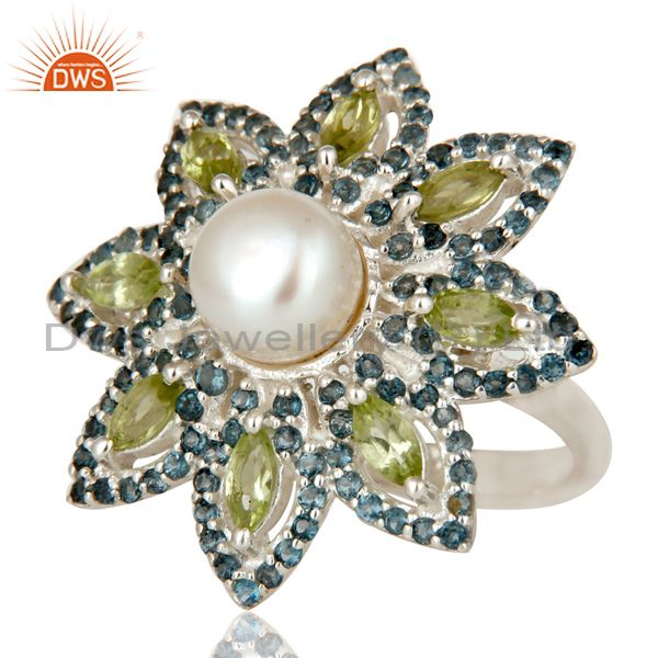 Pearl, Peridot and Blue Topaz Sterling Silver Flower Design Cocktail Ring