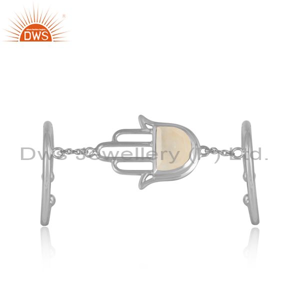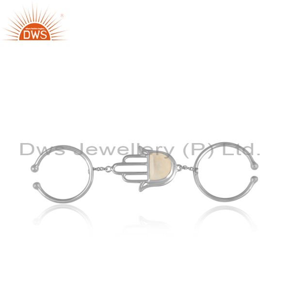 Rainbow Moon Stone Set Fine Silver Hamsa Double Finger Ring