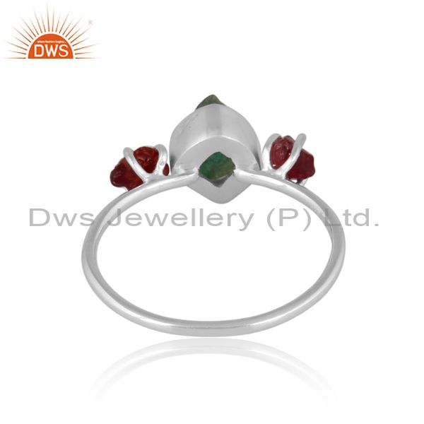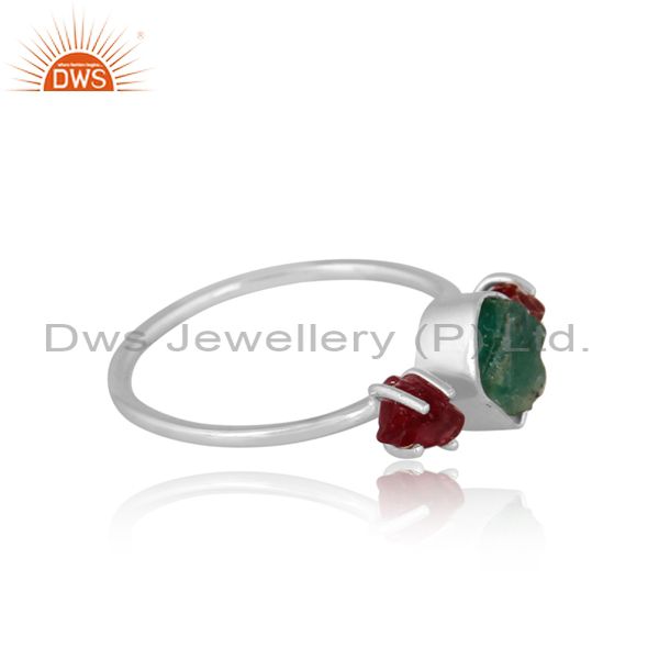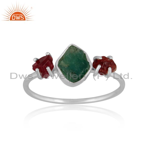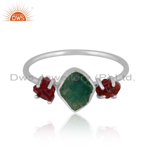 Rough Cut Emerald And Spinel Ruby Fine Silver Statement Ring