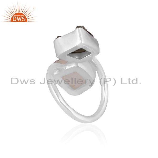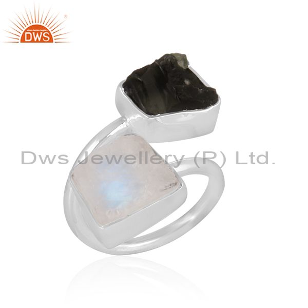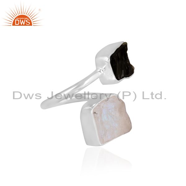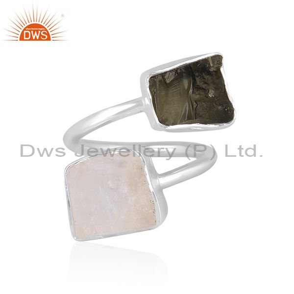 Rough Cut Moldavite And Rainbow Moon Stone Fine Silver Ring